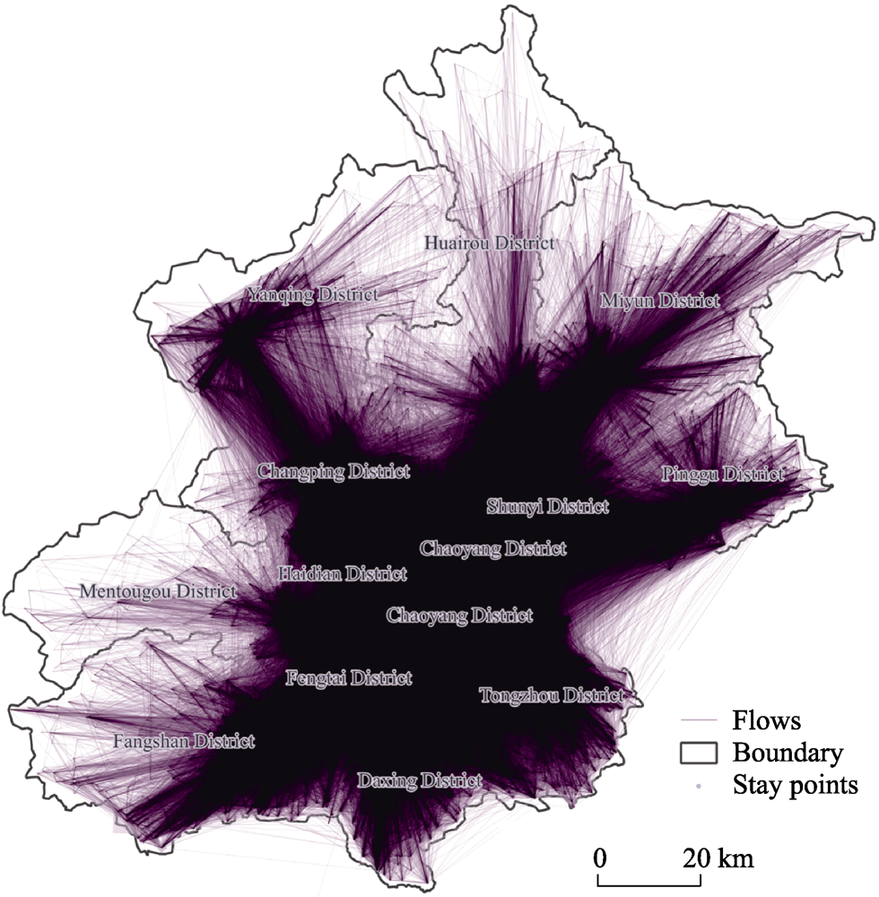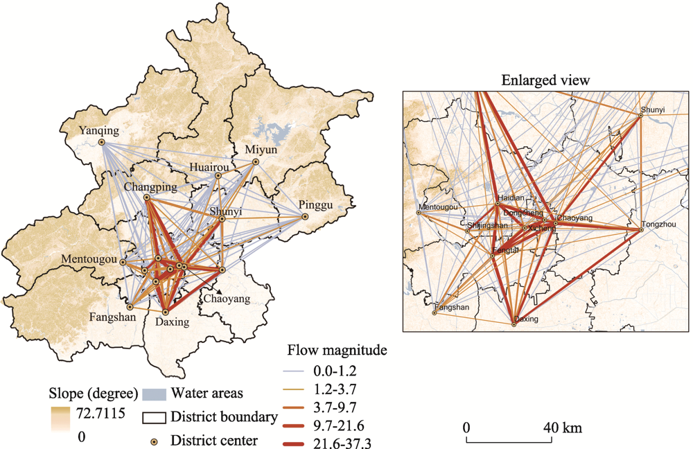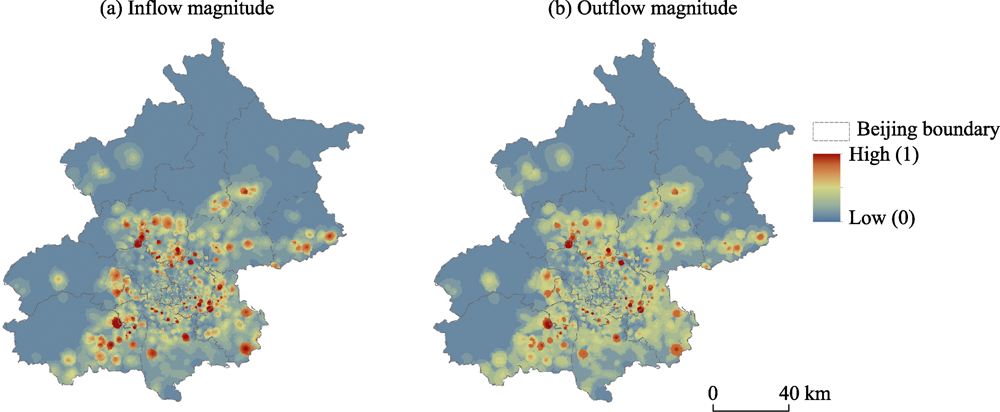 The inflow magnitude distribution (a) and the outflow magnitude distribution (b) of Beijing