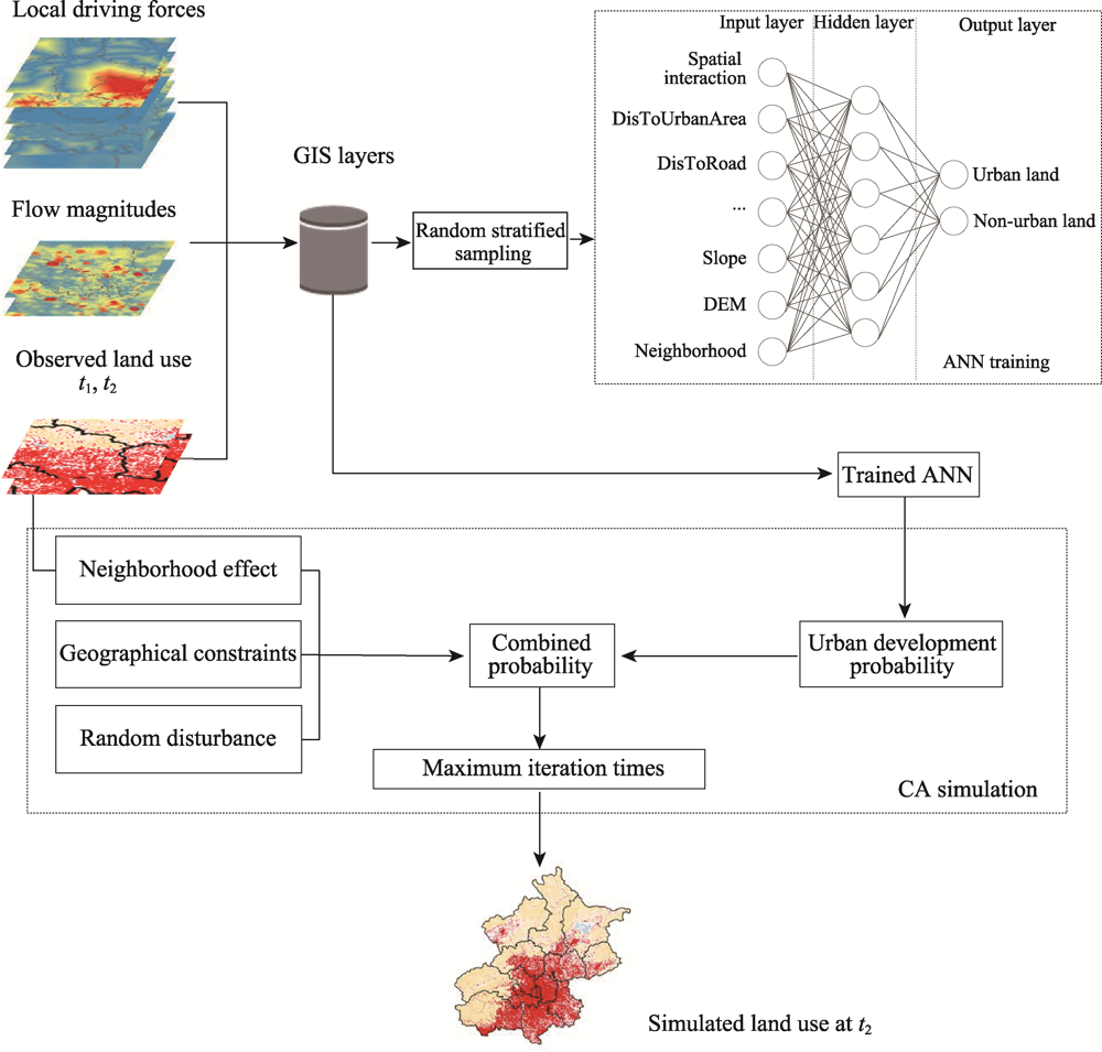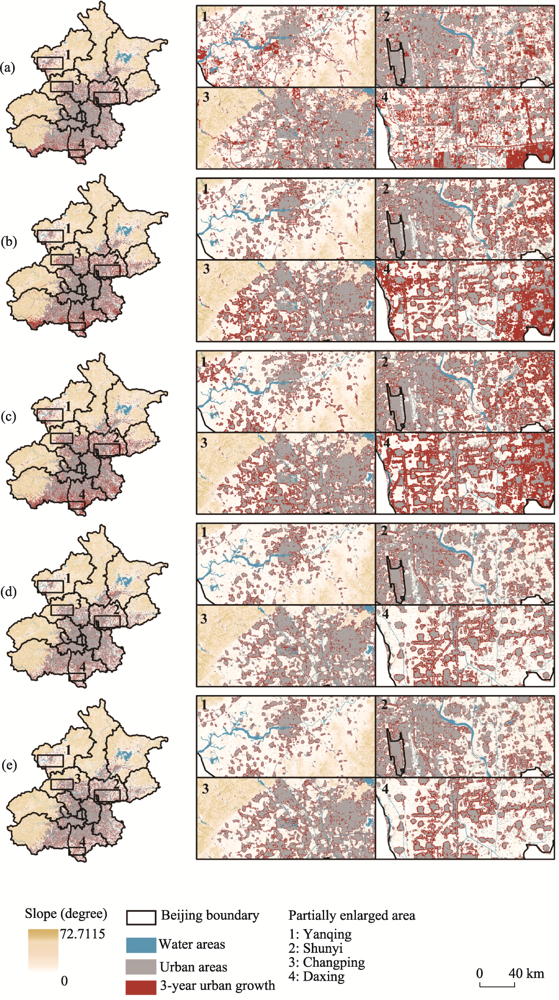 The observed urban growth from 2013 to 2016 in Beijing (a) and the simulated pattern in 2016 based on the four proposed models: (b) ANN-CA