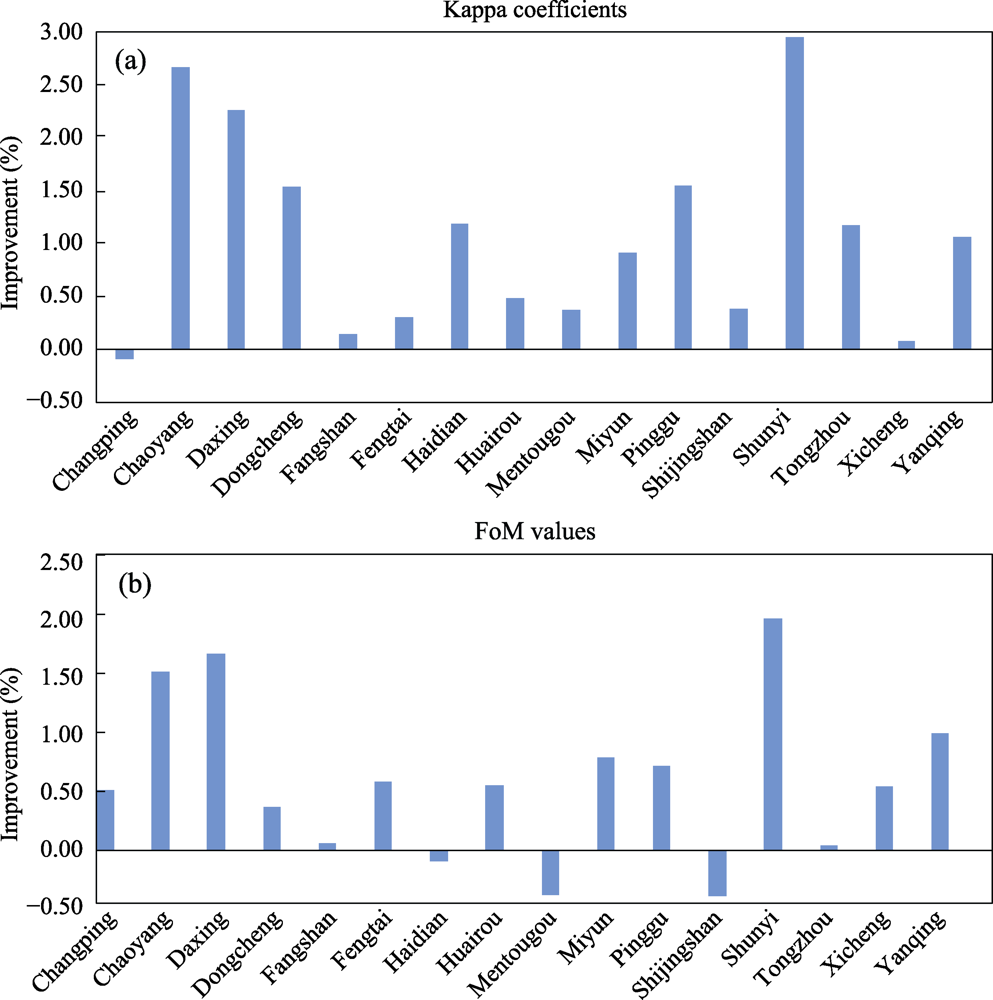 Resultant improvements of Kappa coefficients and FoM values of the simulation results for districts of Beijing based on ANN-CA