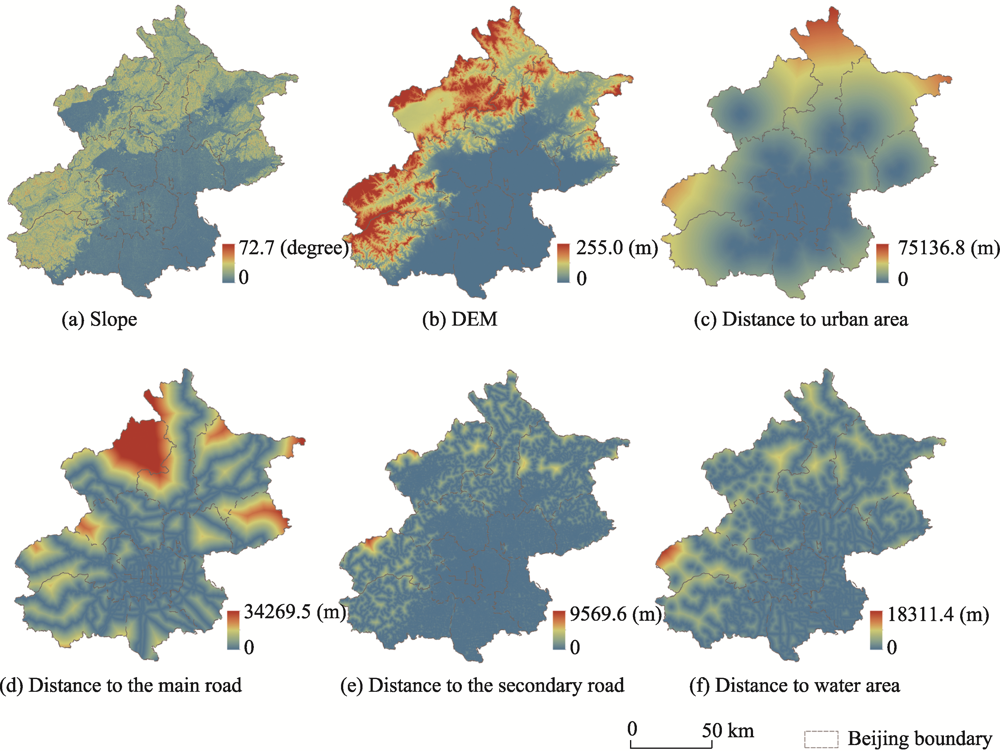 The spatial variables in Beijing (a) slope, (b) DEM, (c) distance to urban area, (d) distance to the main road, (e) distance to the secondary road, and (f) distance to water area