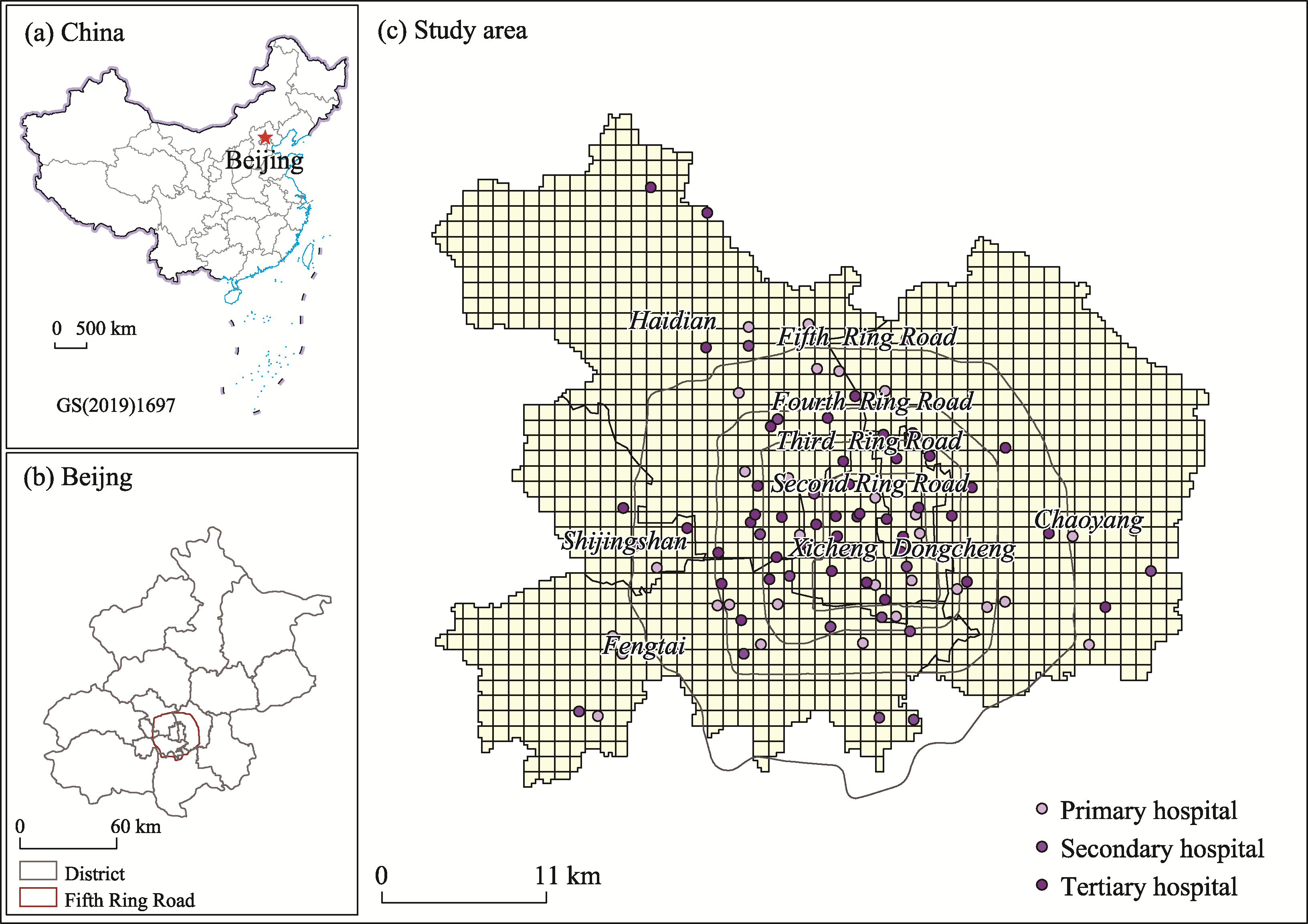 Location of Beijing in China (a); location of the study area in Beijing (b); study area (six urban districts), unit (1 km*1 km grid cell), and the distribution of hospitals (c)