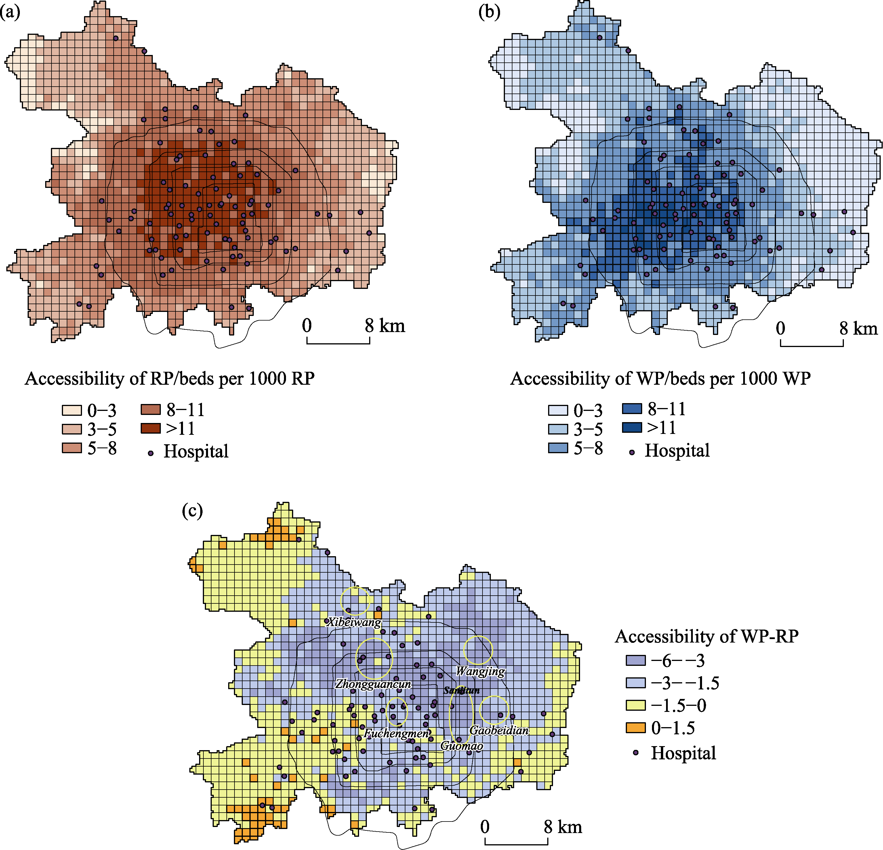 Spatial patterns of healthcare accessibility for (a) residential populations (RP) and (b) worktime populations (WP), with (c) a comparison between the two
