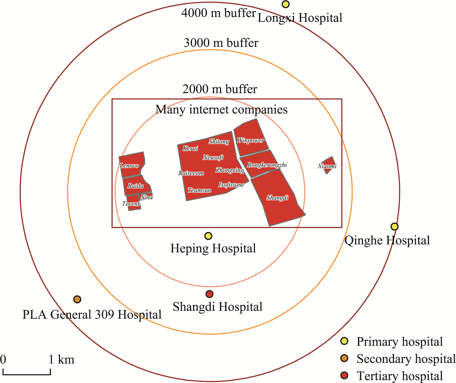 Distribution of hospitals and large enterprises in the Xibeiwang area