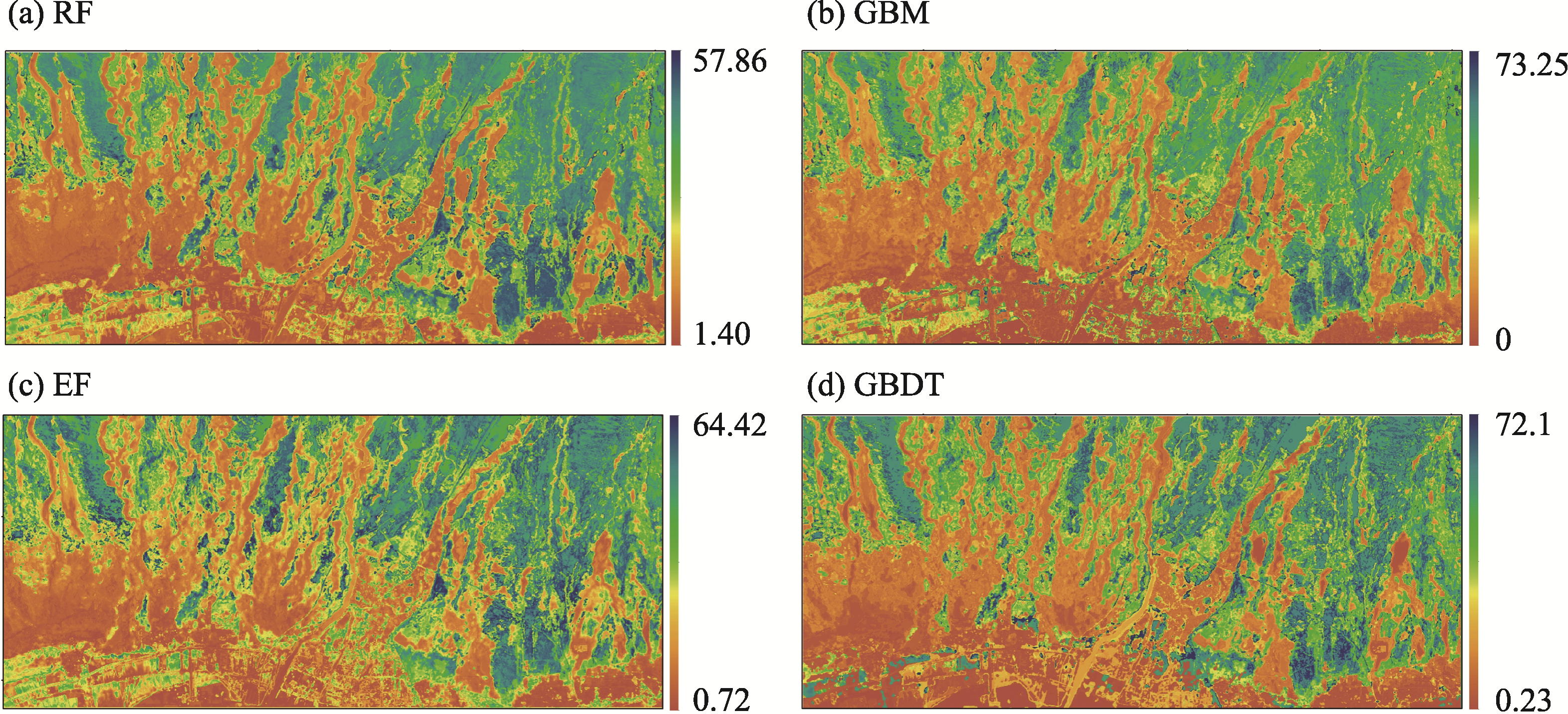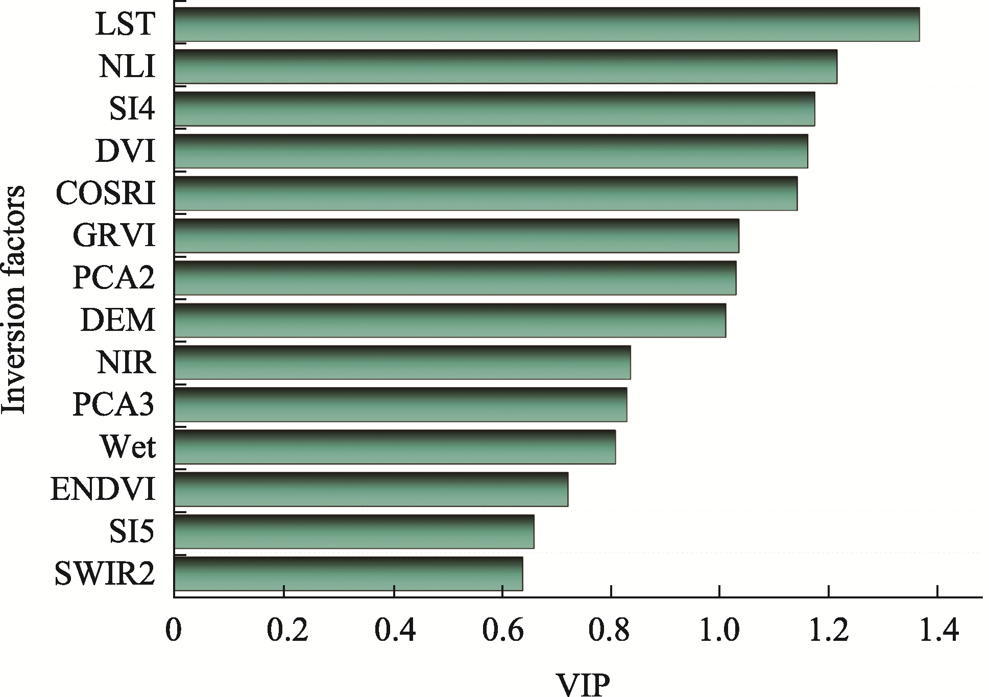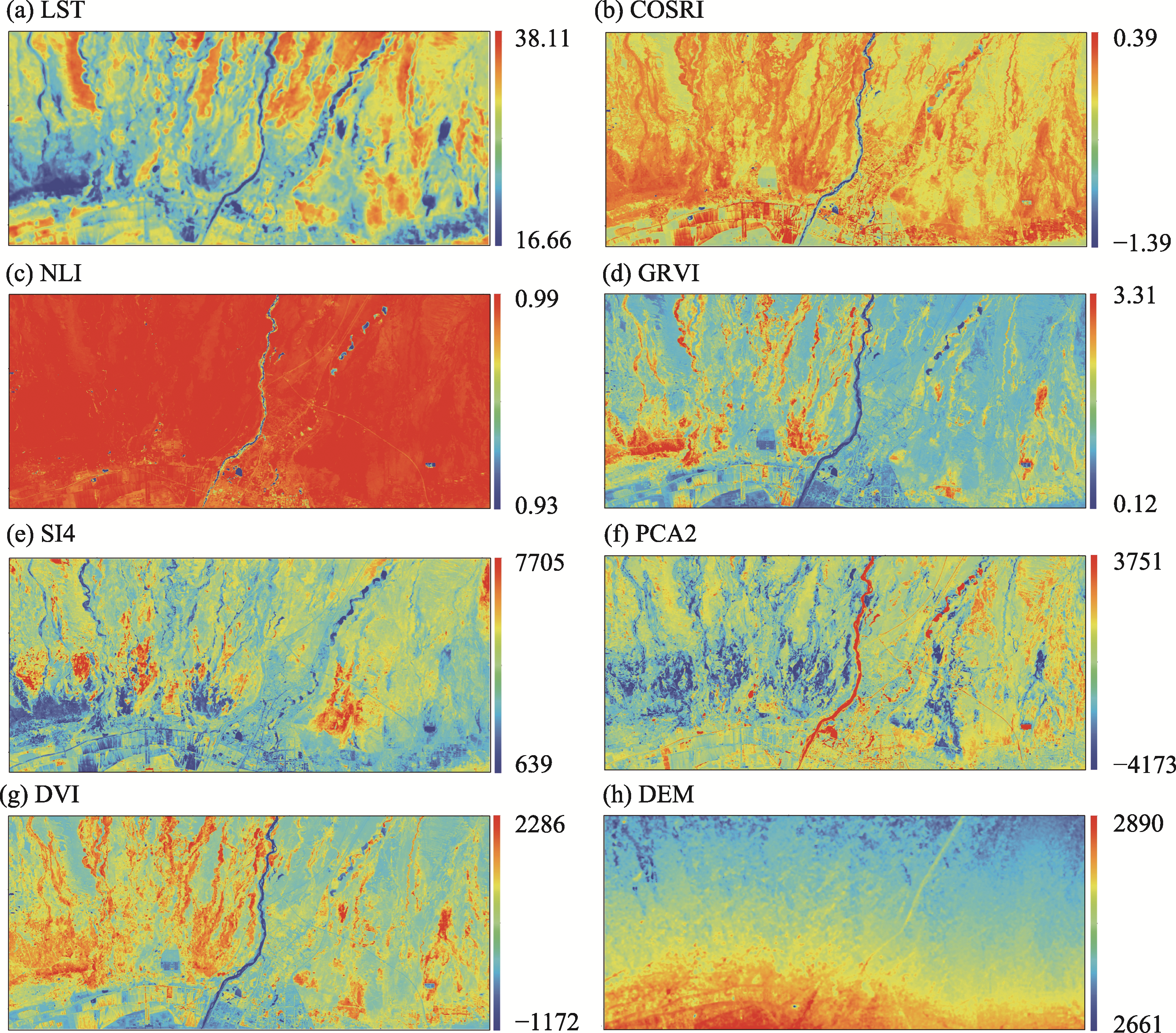 Figure 6 The eight key factors (COSRI, NLI, DVI, GRVI, DEM, SI4, PCA2 and LST) for soil salinization modeling