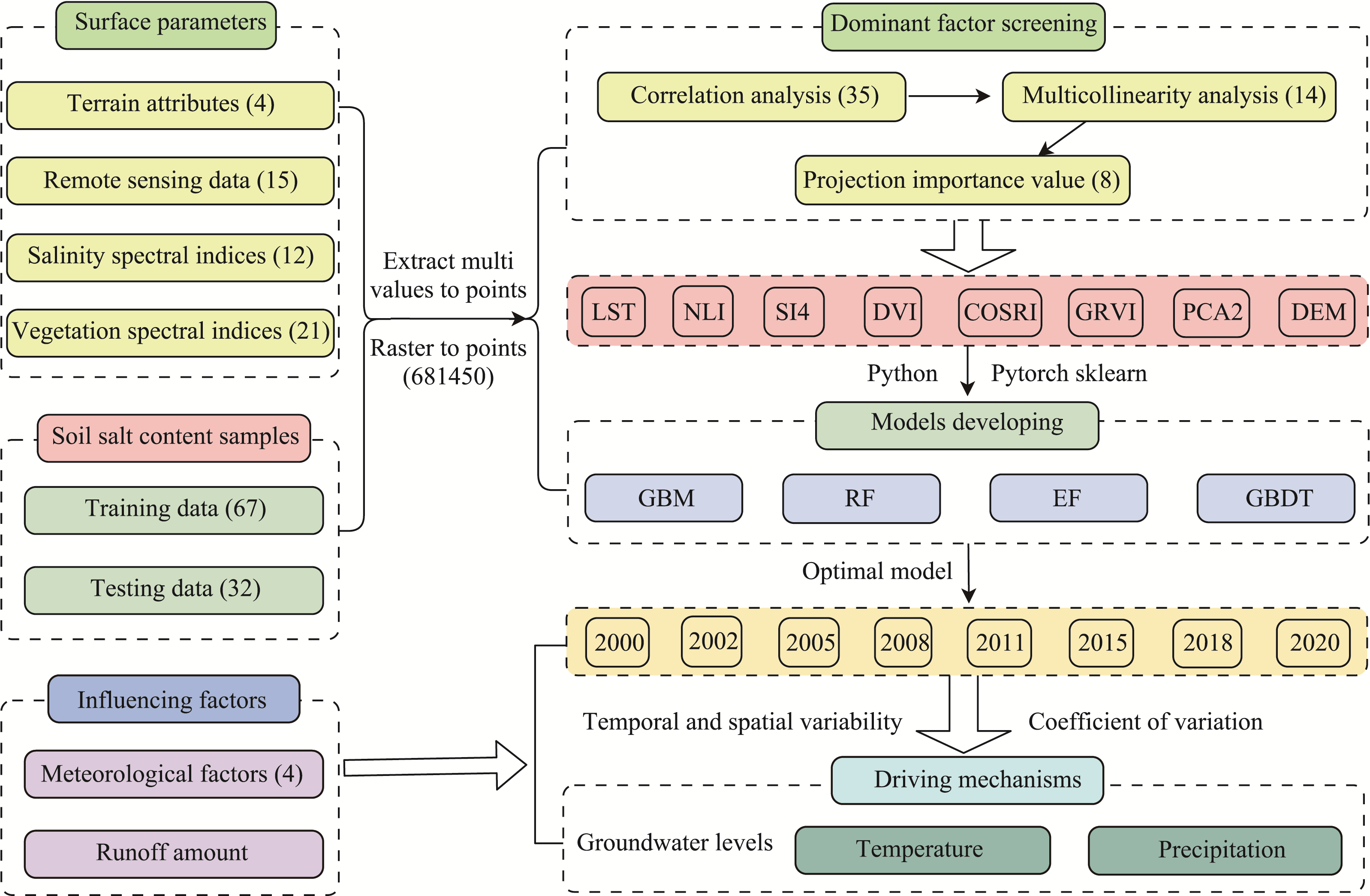 Quantitative inversion of soil salinization in salt lake regions:Spatiotemporal variation and driving mechanisms