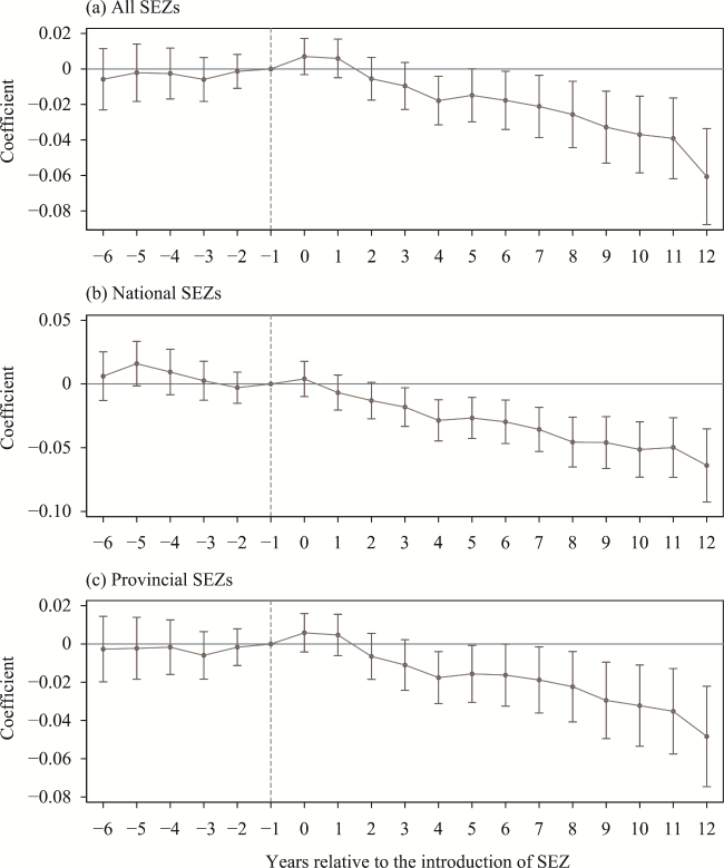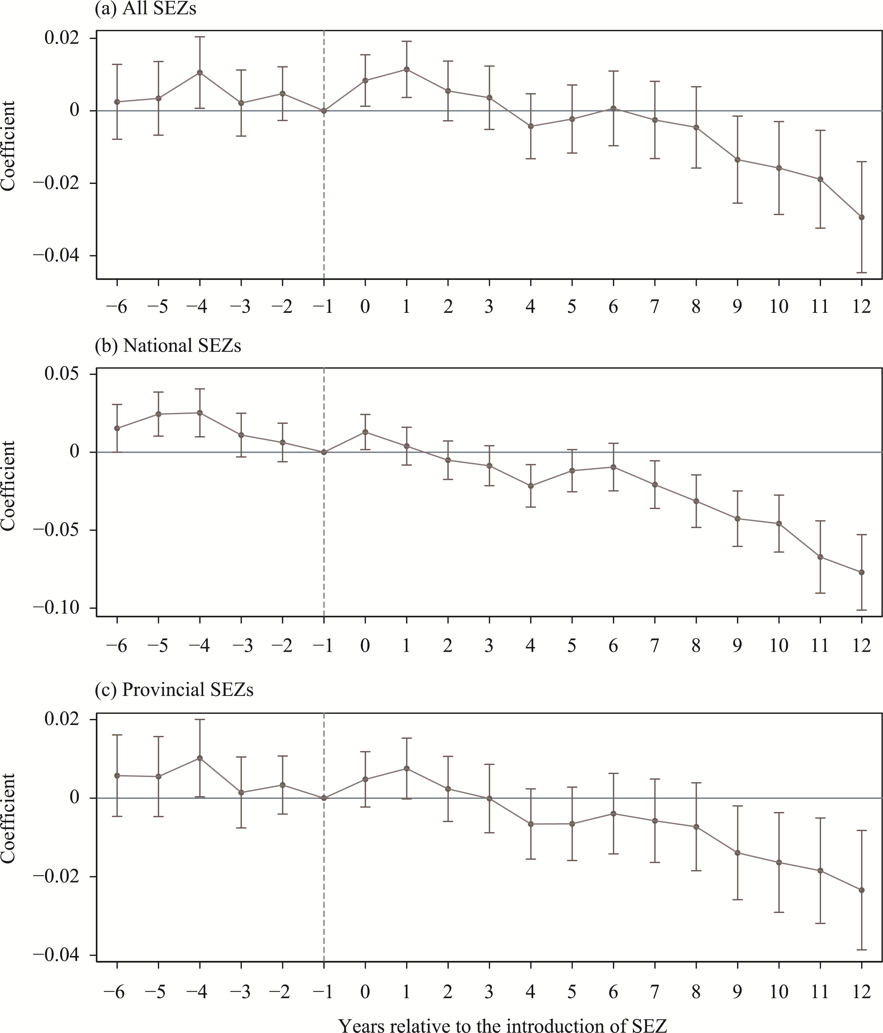 Figure 4 Event study of all special economic zones (a), national special economic zones (b) and provincial special economic zones (c)Notes: 0 means the year when the first SEZ was launched, -1 represents the one year before SEZ operation and so on, and 1 refers to the time that is one year after SEZ operation. |