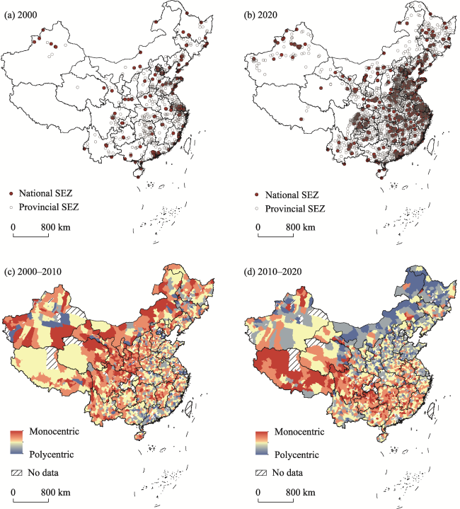 Figure 3 Distribution of special economic zones (a-b) and change in spatial structure in China at the county level (c-d) in 2000-2020 |