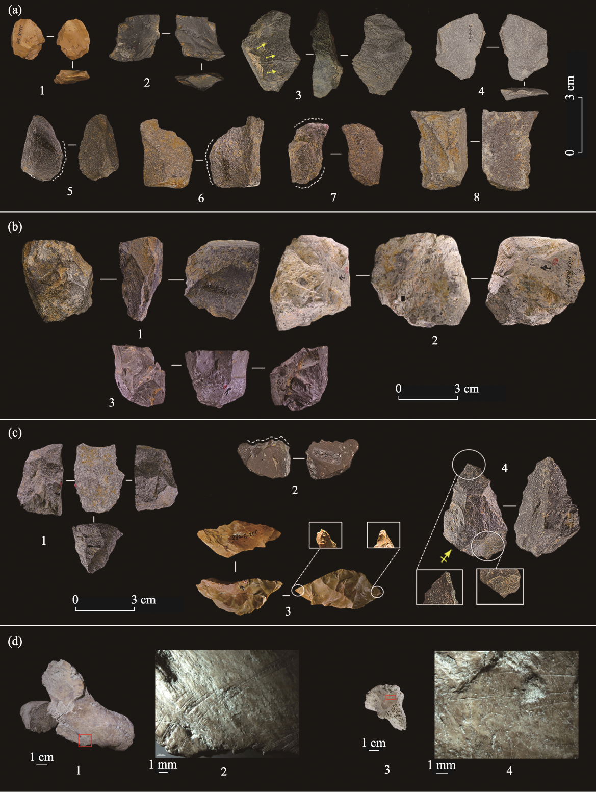 Figure 2 Selected lithic artifacts and animal bones from JJZ site. (a) Flakes: 1. Bipolar flake; 2, 4. Freehand percussion flakes; 3. Core-edge flake; 5-7. Flake with use wear; 8. Elongate flake. (b) Cores: 1-2. Multifacial cores; 3. Unifacial core. (c) Retouched tools: 1. Scraper; 2. Denticulate. 3. Bore; 4. Point. (d) animal bones: 1-2. A cervical vertebrate with carnivore tooth marks and percussion marks; 3-4. An occipital condyle with carnivore tooth marks overlying cutmarks. |