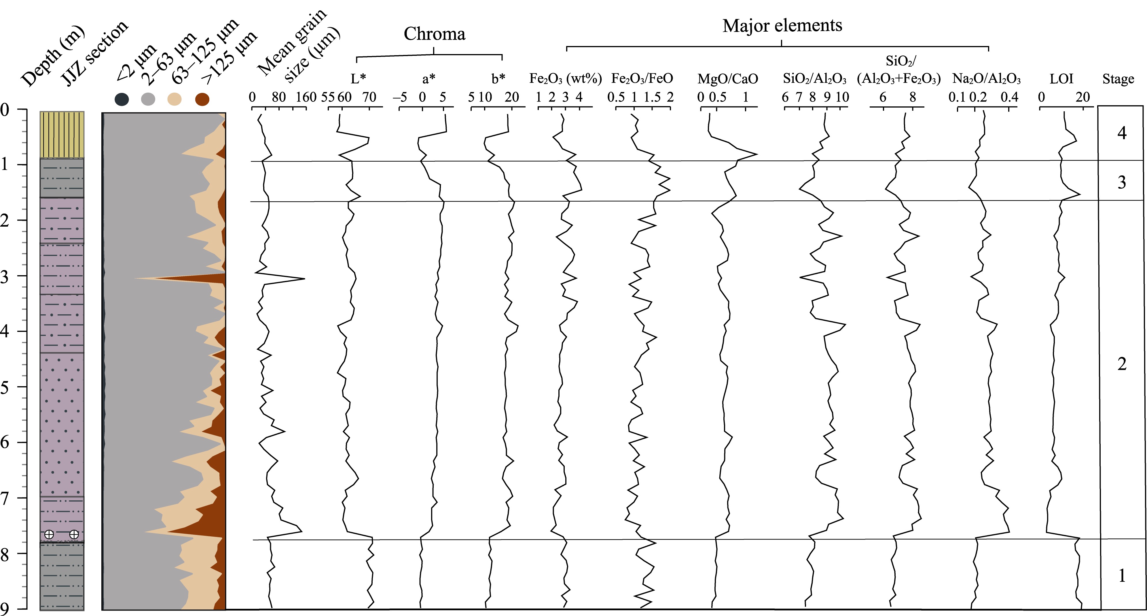 Figure 4 Variation curve of grain size, color records, Fe2O3, and molar ratios of Fe2O3/FeO, MgO/CaO, SiO2/Al2O3, SiO2/(Al2O3+Fe2O3), Na2O/Al2O3 and LOI from the section at JJZ site. The legend of the JJZ section can be seen in Figure 1, the position of artifact legends in the lithology indicates the artifact layer. |