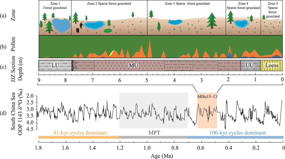 Figure 5 Synthesis of ecological and landscape history of the JJZ site in the Nihewan Basin. (a) Hypothetical setting of JJZ archaeological landscape. (b) Pollen results of the JJZ archaeostratigraphic sequence (different colors represent different vegetation types as shown in Figure 3). (c) Lithology of JJZ archaeostratigraphic sequence (different colors represent different units as shown in Figure 1). (d) δ18O record from ODP Site 1143, South China Sea (Tian et al., 2002). |
