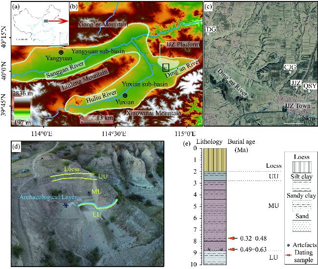 Figure 1 Geographical and geochronological background of the Jijiazhuang site in the Nihewan Basin. (a-b) Location of the Nihewan Basin (Drawing review No.GS(2016) 1594); (c) Google Earth image showing location of key archaeological sites in the Jijiazhuang Platform; (d) Photo showing the geomorphological setting of the Jijiazhuang site; (e) Stratigraphic sequence and cosmogenic burial ages of Jijiazhuang site. Abbreviations of the strata unit and the sites: Loess (Yellow color in the lithology); UU-Upper Unit (Dark gray color in the lithology); MU-Middle Unit (Brown gray color in the lithology); LU- Lower Unit (Light gray color in the lithology); JJZ-Jijiazhuang site; QSY-Qianshangying site; CJG-Caijiagou site; DG-Donggou site. |