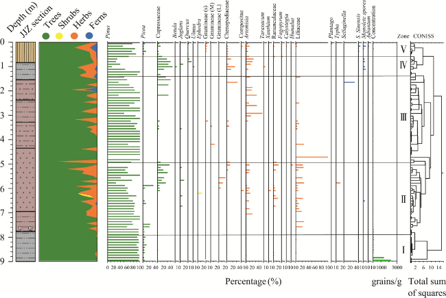Figure 3 Pollen percentage diagram of the section at the JJZ site. The legend of JJZ section can be seen in Figure 1, the position of artifact legends in the lithology indicates the artifact layer. |