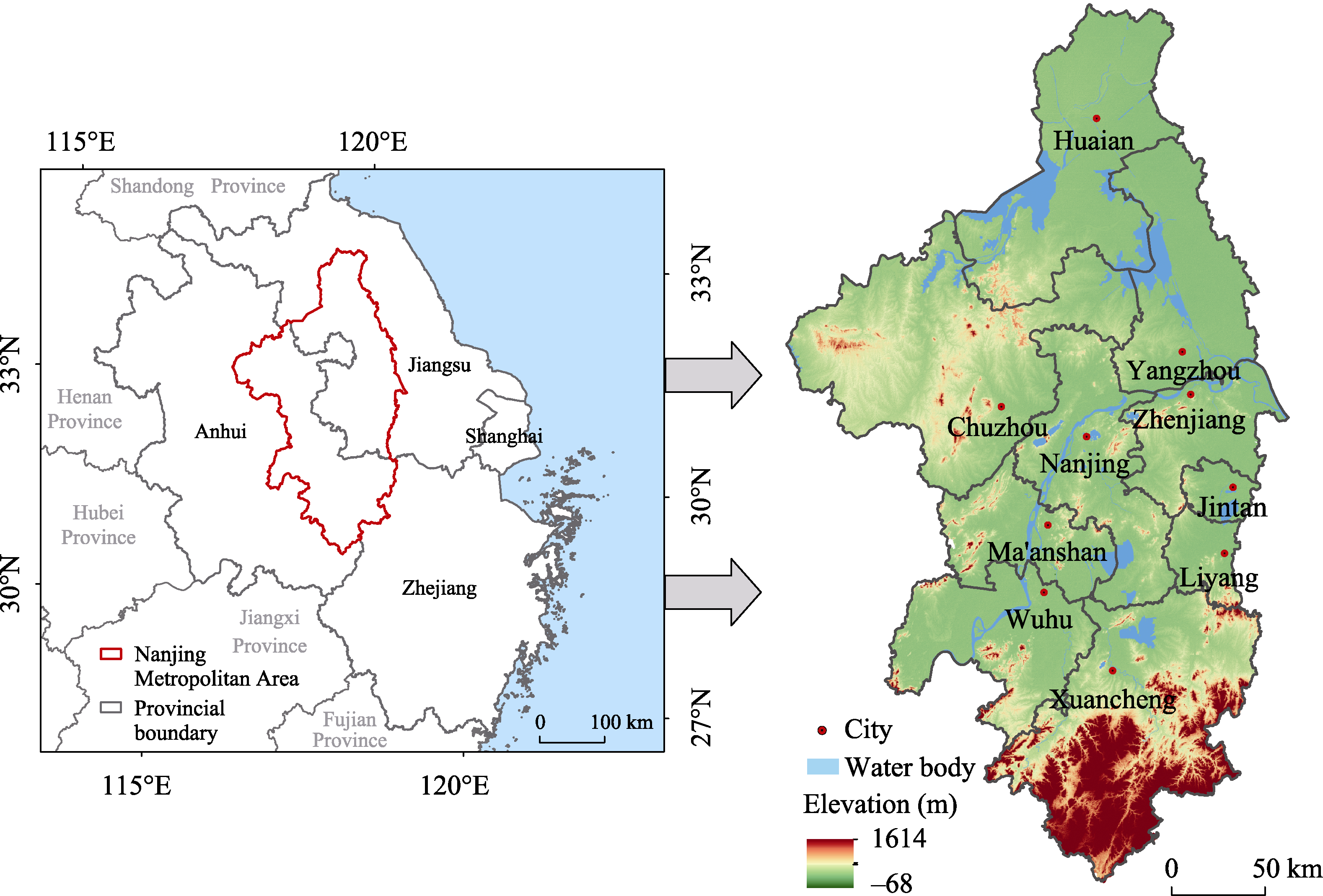 Administrative divisions and terrain of the study area (Nanjing Metropolitan Area)