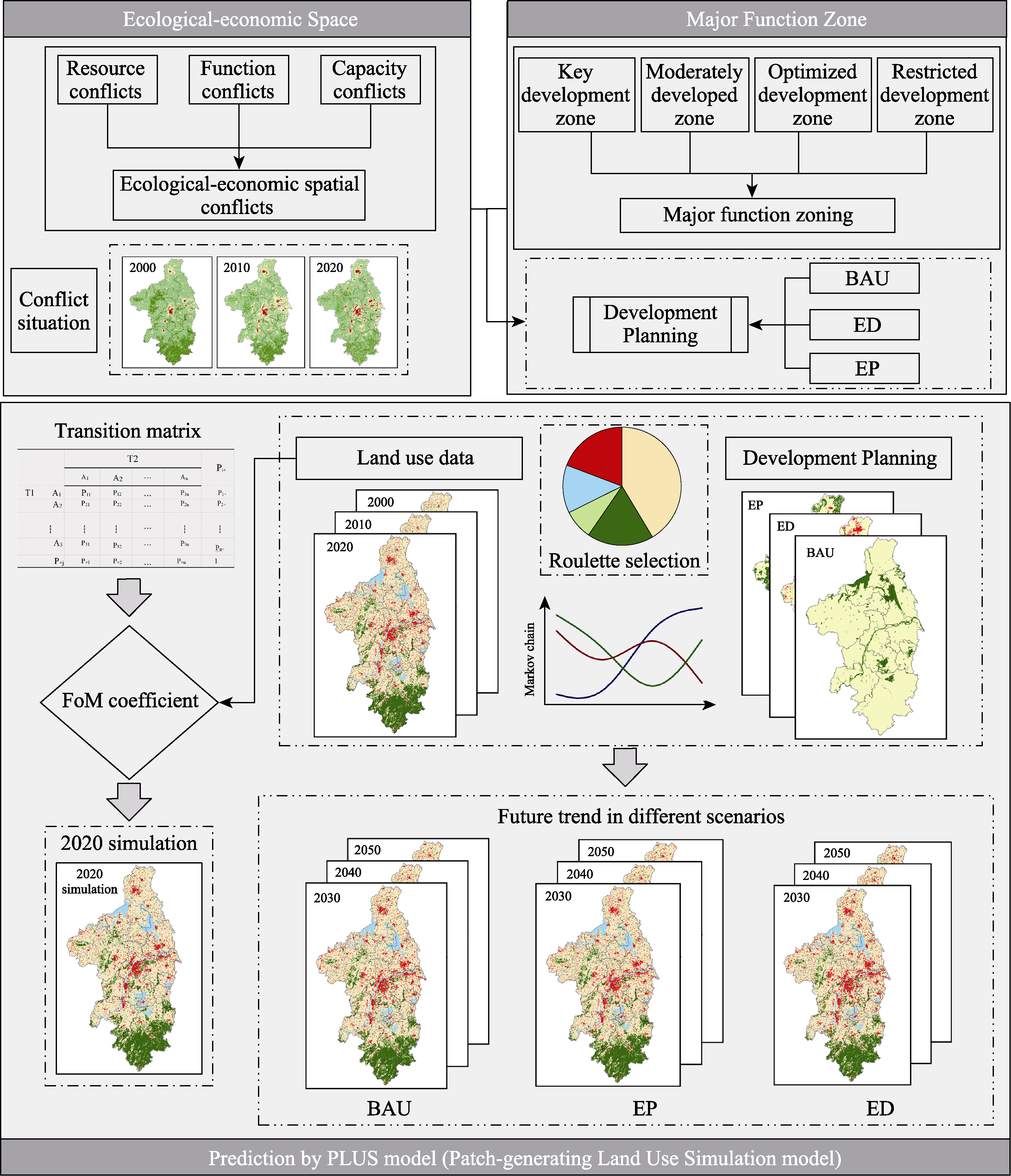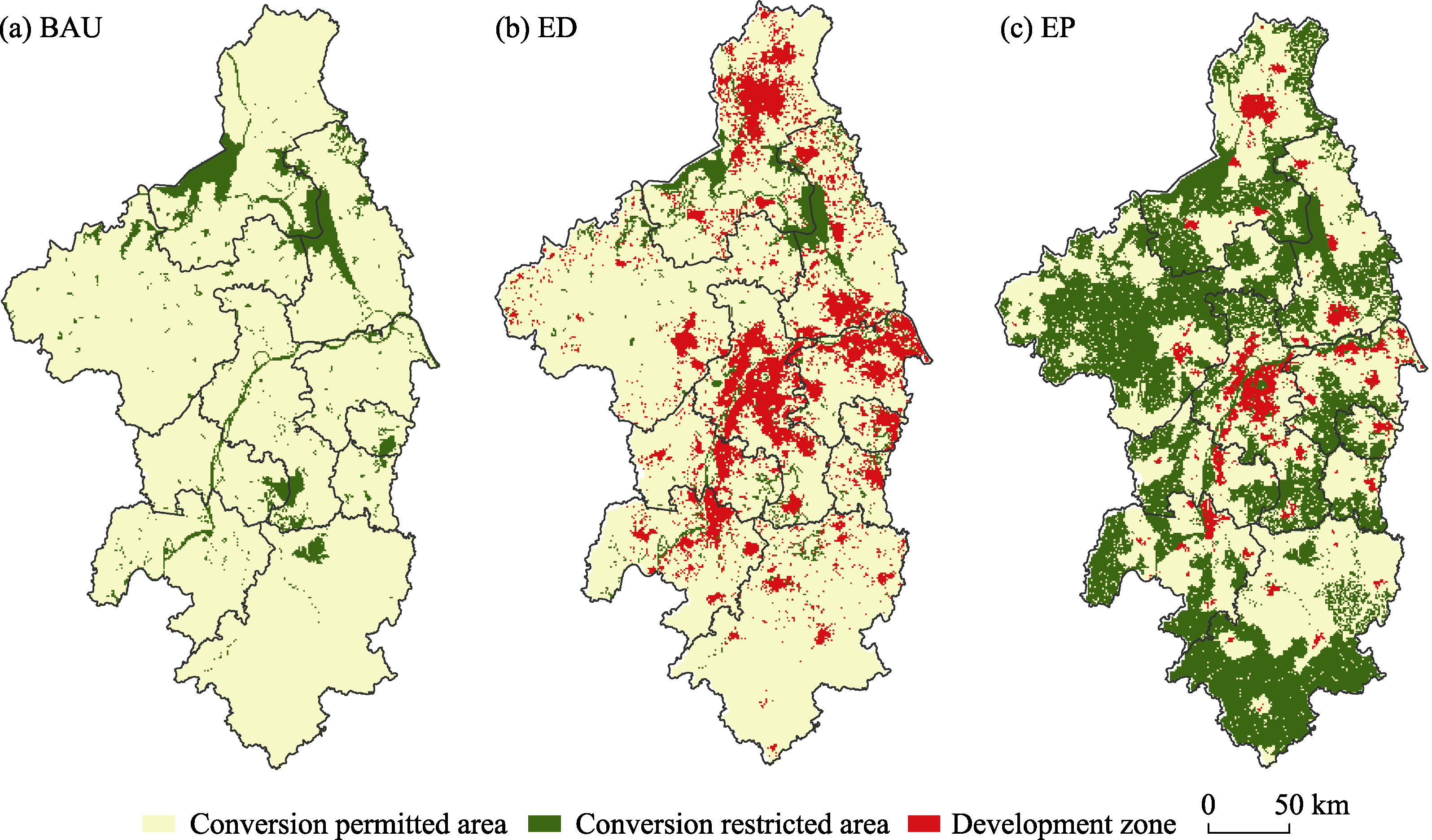 Setting diagram of the development zone under different scenarios in Nanjing Metropolitan Area (a. BAU scenario; b. ED scenario; c. EP scenario)