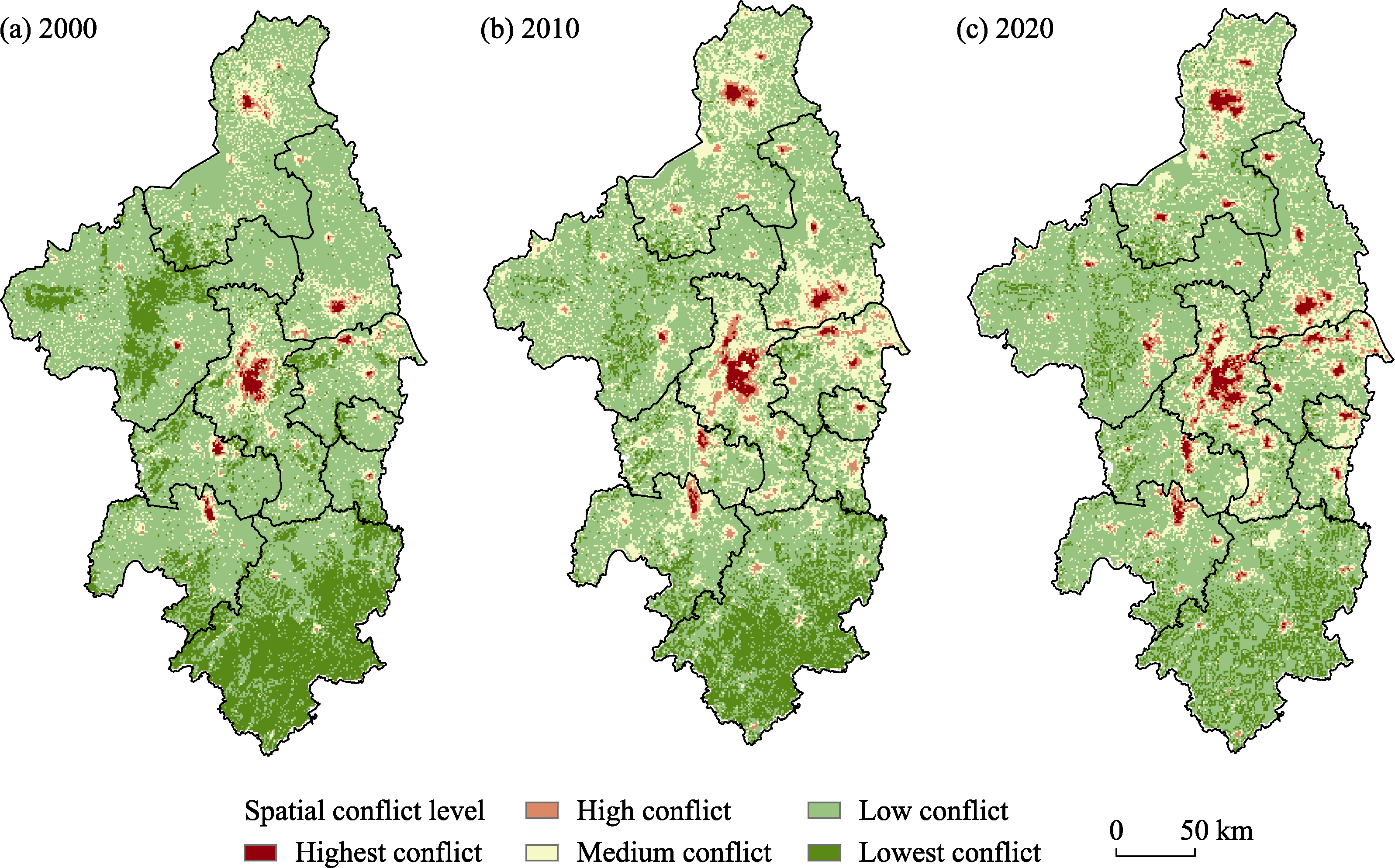Distribution of ecological-economic spatial conflict in Nanjing Metropolitan Area (a. 2000; b. 2010; c. 2020)