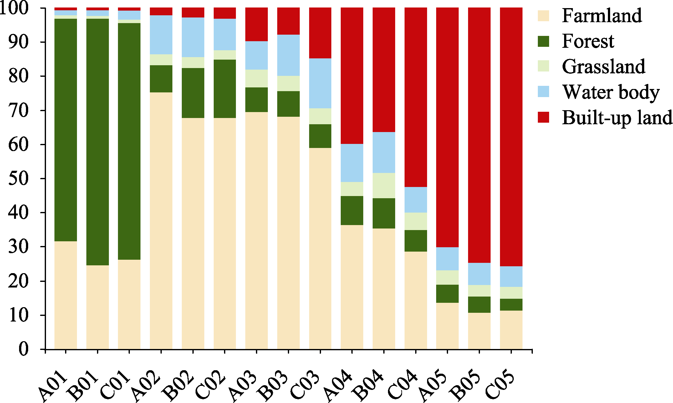 (A, B and C refer to 2000, 2010 and 2020; 01, 02, 03, 04 and 05 refer to lowest, low, medium, high, highest spatial conflict levels, respectively.)