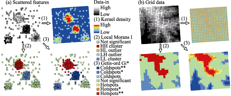 | Figure 7 Comparison of three hotspot analysis methods: KDE (1), Local Moran’s I (2), Getis-Ord Gi* statistics (3) Note: When input features are spatially scattered (see Figure 7a), the KDE can only identify spatial cluster, but it mixes the cluster of high values (i.e., hotspots) and the cluster of low values (coldspots); that is, the KDE can neither tell what the cluster is nor whether it is significant. Fortunately, the Local Moran’s I and Getis-Ord Gi* statistics can both make it. The difference is that the Local Moran’s I is more efficient at identifying the outliers (see Figure 7a-(2) above), while the Gi* statistics is even better at identifying statistically significant hotspots and coldspots with different confidence levels (see Figure 7a-(3)). When input features are spatially uniform grid data (see Figure 7b), the KDE becomes inefficient, while the Local Moran’s I and Gi* statistics work well in this case, and the Gi* statistics especially holds its unique superiority. |